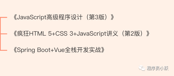 《JavaScript高级程序设计(第3版)》要学好前端,JavaScript 是必须的 《疯狂HTML 5+CSS 3+JavaScript讲义(第2版)》跃哥学习的就是和本书,学会了基础才能走的更远嘛,对吧 《Spring Boot+Vue全栈开发实战》这本书是王松老哥写的,我向他取了好几次经,Vue 框架也是现在前端很流行的框架了,作者还是我们国人尤雨溪,骄傲吧 React.js 也是经典的框架,这里属于我的盲区,就不推荐书单了