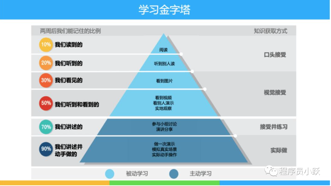 被动学习:如听讲、阅读、视听、演示,学习内容的平均留存率为 5%、10%、20% 和 30%。 主动学习:如通过讨论、实践、教授给他人,会将原来被动学习的内容留存率从 5% 提升到 50%、75% 和 90%。