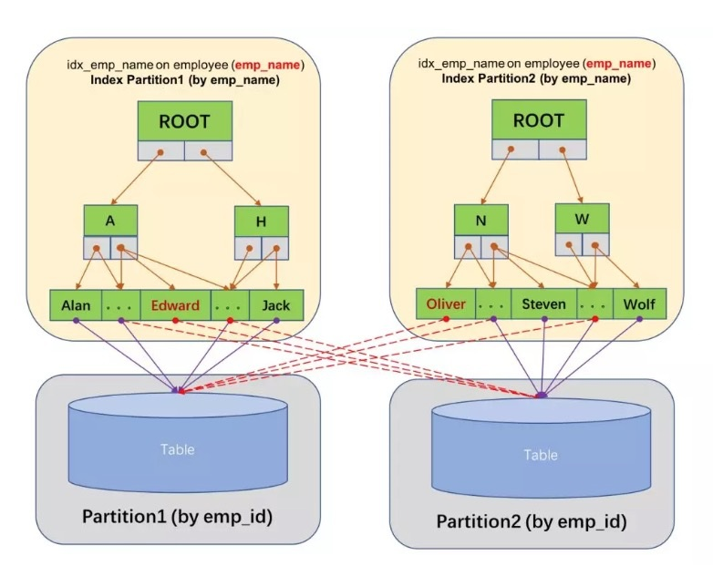 在上图中, employee 表按照 emp_id 做了范围分区, 同时也在 emp_name 上创建了本地索引。