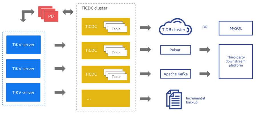 TiCDC是一款通过拉取 TiKV 变更日志实现的 TiDB 增量数据同步工具,具有将数据还原到与上游任意 TSO 一致状态的能力,同时提供开放数据协议 (TiCDC Open Protocol),支持其他系统订阅数据变更。