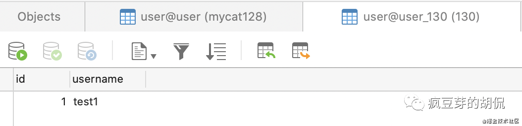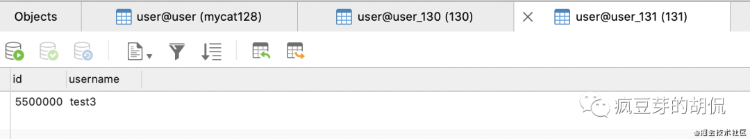 然后我们会看到这两个数据分别在2个数据库里面, 这就是mycat的分片: