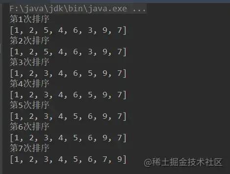 public class SelectSort {public static void main(String[] args) {int[] number = {2,1,5,4,6,3,9,7};Sort(number);}public static void Sort(int[] numbers){for (int i = 0; i < numbers.length-1; i++) {最小下标int miniIndex = i;最小值int mini = numbers[i];//遍历比较for (int j = i+1; j < numbers.length; j++) {if (mini > numbers[j]) {miniIndex = j ;mini = numbers[j ];}}if (miniIndex != i) {numbers[miniIndex] = numbers[i];numbers[i] = mini;}//输出每次排序结果System.out.println("第"+(i+1)+"次排序");System.out.println(Arrays.toString(numbers));}}}