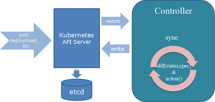 Kubernetes作为一个“容器编排”平台,其核心是对资源对象进行”编排“,而控制器(controller)则负责此工作。控制器对资源对象的操作可以看作是一个状态机操作,不断对资源对象进行轮询,比较其当前状态(status)和期望状态(spec)并做出反应,使资源对象的状态满足其期望的要求。Kubernetes核心组件controller manager中包含对各个内建资源进行管理的contoller,如node controller、service controller、namespace controller等。
