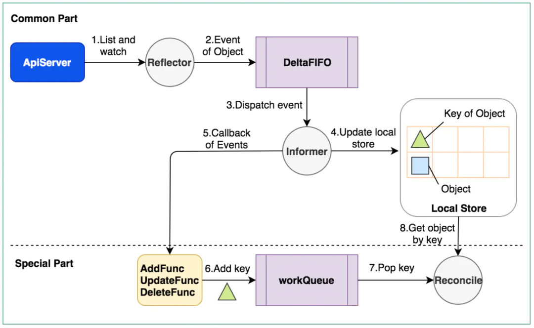 该部分已由kubernetes client实现,完成了与apiserver的通信、授权、资源监听、资源对象反射、和本地缓存等通用功能(图中步骤1-4)。同时提供调用接口(图中步骤5),在监听到资源对象发生变化时通知用户进行处理。