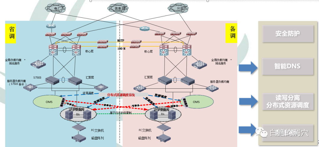 实际上这种读写分离的数据库架构在很多企业都有十分成功的应用,最为典型的是MYSQL的MGR集群和MHA,以及Oracle的ADG。在2015年,我们为某电力公司的某个调度专业的系统设计双活方案的时候,就和达梦公司一起合作过一个基于达梦数据库准同步复制、JDBC引擎使用读写分离代理模式的技术方案。当时客户的系统主站和副站位于两个城市,中间的光纤距离是103公里左右。主站使用国产的服务器,凝思操作系统,国产分布式存储系统,达梦数据库,副站使用国产服务器、凝思操作系统,华为集中式存储系统,达梦数据库。全局负载均衡和本地负载均衡采用华三公司的国产方案。这是一套全国产的双活系统。