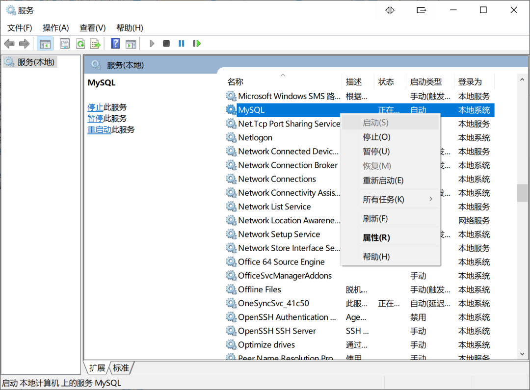 然后在Windows的服务窗口重启MySQL服务,cmd-services.msc,