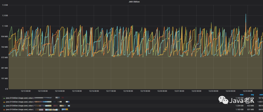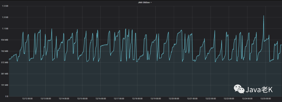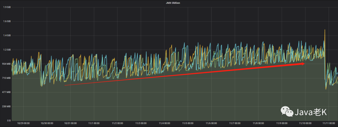 打开公司监控系统查看应用各项指标发现JVM中老年代在持续增长(从上次发布10月30号到11月10号的12天内一直在增长, 存在内存泄露迹象)