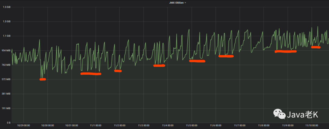 从图中可以看出, 从10月30号发布到11月10号oom期间11天老年代一直在缓慢上涨, 虽然有下降, 但整体趋势是上升的,平均每天泄露约50M内存, 说明每次都无法完全释放干净