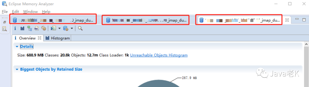 把下载到本地的多个dump文件用mat依次打开("File → Open Heap Dump"), 如下图: