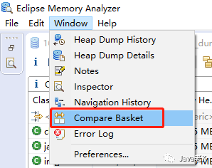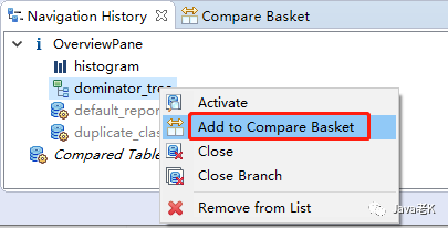 3> 我们以支配树做比对, 在最下面一栏的"Navigation History (window → navigation history)"里(直方图类似)找到在第2步打开的支配树dominator tree图标, 右键添加到compare basket, 如下图: