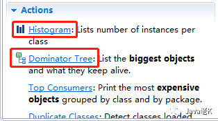 2> 依次打开3个dump的dashboard面板, 在下方的 Actions一栏点击"histogram"或"dominator tree"生成对应的直方图或支配树列表,如下图: