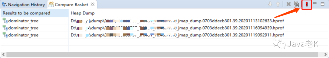 (注意比较的dump文件的顺序,时间最早的在上面,可以通过右上角的上箭头↑和下箭头↓调整顺序)