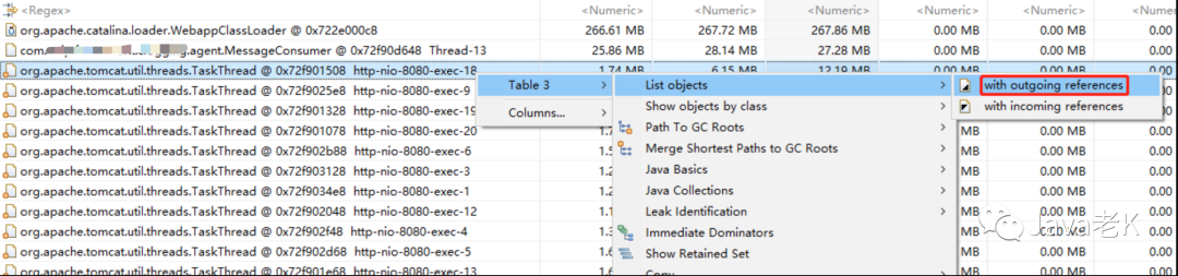 一般我们主要关注红框标出的对象, 因为这部分发生内存泄露的嫌疑最大