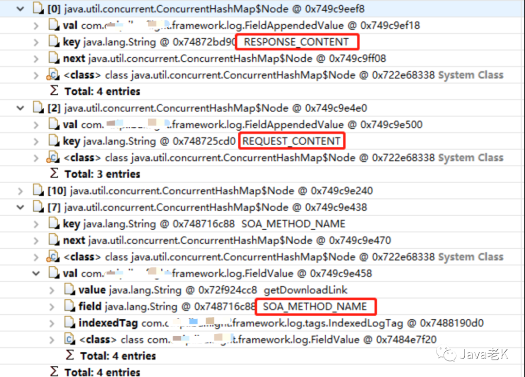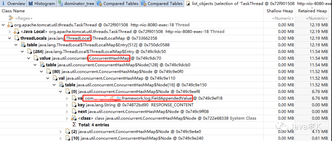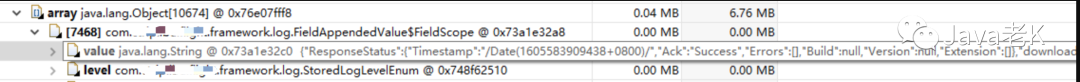 但为什么日志对象会占用这么多内存?而且这里看到的只是其中一个taskThread里,继续展开RESPONSE_CONTENT的val对象FieldAppendedValue