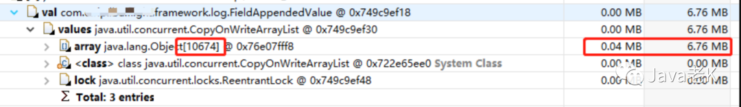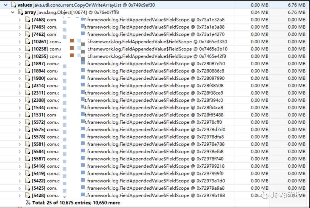 对象, 这个list里竟然存放了10674个值,正常来讲不可能一次接口请求会有这么多的日志对象, 而且接口请求完记录到ES后, 这部分内存就应该释放了才对。