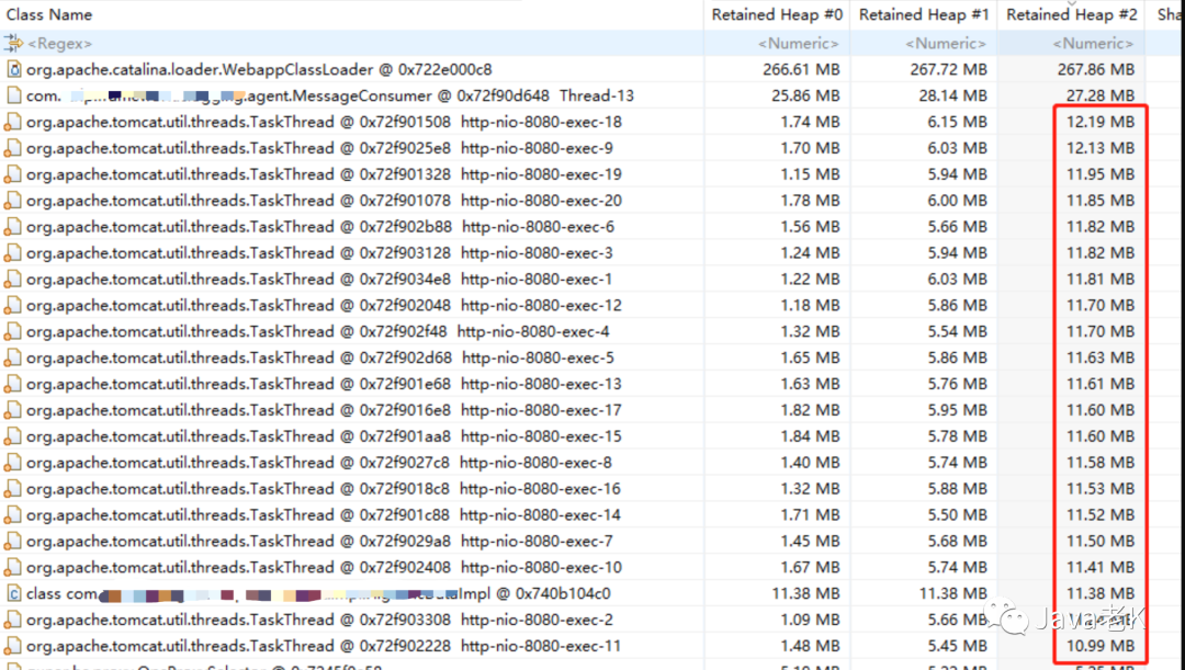 因为这里我们比较的是支配树, 所以按照retained heap倒序排列, 从左到右依次为: retained heap #0 → retained heap #1 → retained heap #2(以最后一个retained heap #2 倒序, 因为这个是最后一次dump的内存快照, 这样可以看出内存泄露的增长趋势)