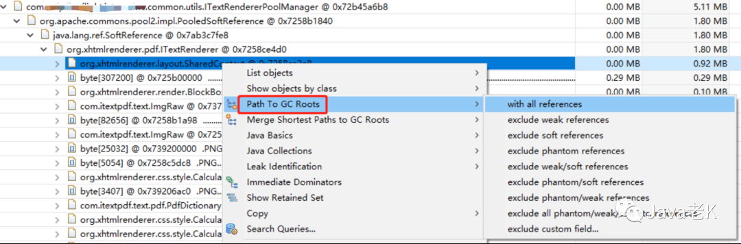 这里可以通过"path to gc root"查看是谁在引用他, 即我们业务代码调用的地方,如下图: