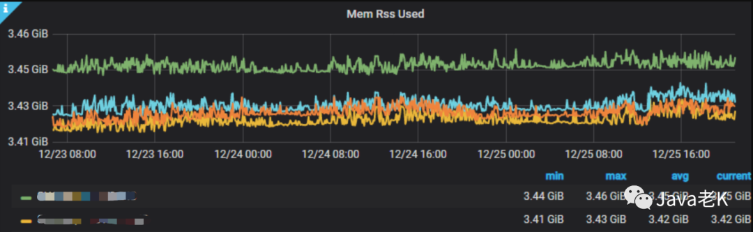 修复上述两个问题后在测试环境验证通过然后发布上线从12月10号一直截止到今天,大概18天里内存再没有泄露迹象, 堆外内存(RSS-JVM内存)也稳定下来,如下图: