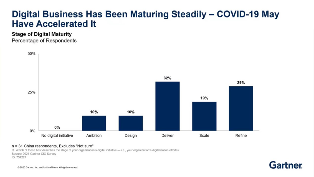 2020受到新冠肺炎疫情的影响,给我国经济生活都带来了很大的冲击,但是在这样的局面下,新冠疫情并没有阻碍企业的数字化转型的进程,甚至在某些地方还加快了数字化转型。从数字化的成熟度来看:在数字化初始阶段,10%的企业已经有了数字化的愿景、10%的企业已经开始设计数字化的解决方案、32%的企业已经开始交付数字化的解决方案。在数字化成熟阶段,19%的企业数字化已经拓展并推广、29%的企业数字化已经在优化和收获的阶段。从调查数据来看,有一半的企业数字化已经成熟了。当然,这是基于企业对自己的评价。