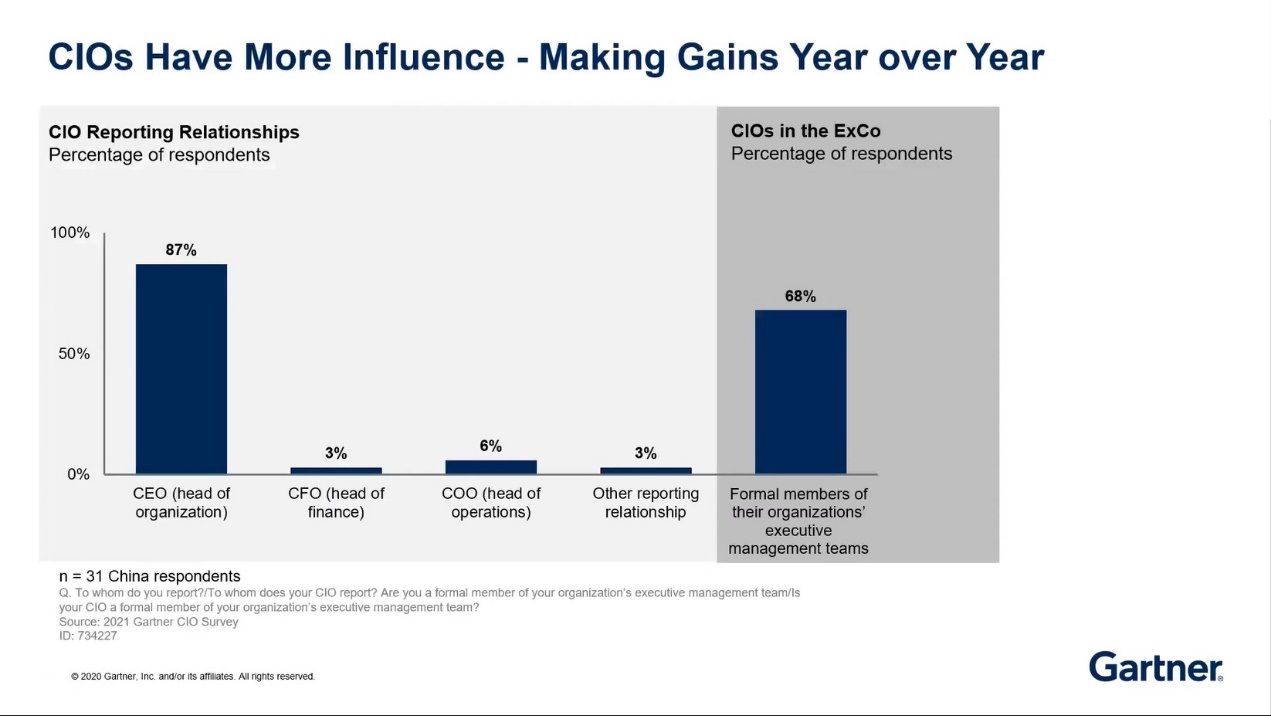 原来CIO在企业中属于支撑型、辅助型的地位,而在新冠疫情中因为CIO帮助企业在这样困难的时候保持正常的运营,体现出了IT对企业的价值,所以CIO在企业中的地位明显的上升。从CIO的汇报对象来看:在中国87%的CIO向CEO或者是组织的最高领导来汇报,这是一个相当高的比例。有的向CFO,或向COO汇报等,这也从另一个方面来说明CIO地位的提高。