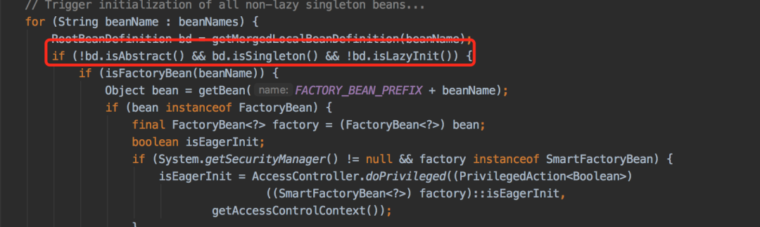 标红的地方明显能够看出:非抽象、单例 并且非懒加载的类才能被提前初始bean。