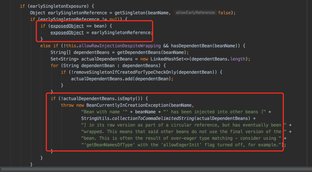 那位同事的问题正好是走到这段代码,发现第二级缓存 和 原始对象不相等,所以抛出了循环依赖的异常。
