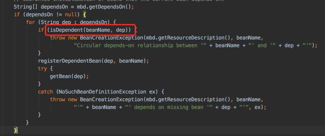 它会检查dependsOn的实例有没有循环依赖,如果有循环依赖则抛异常。
