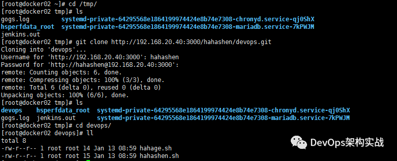 [root@docker02 tmp]# git clone http://192.168.20.40:3000/hahashen/devops.git