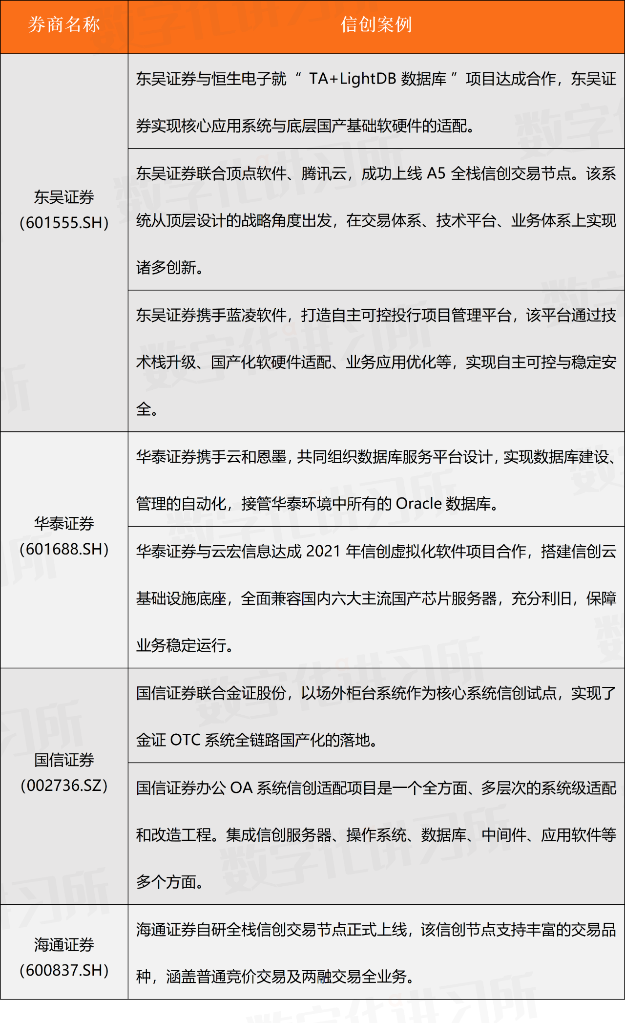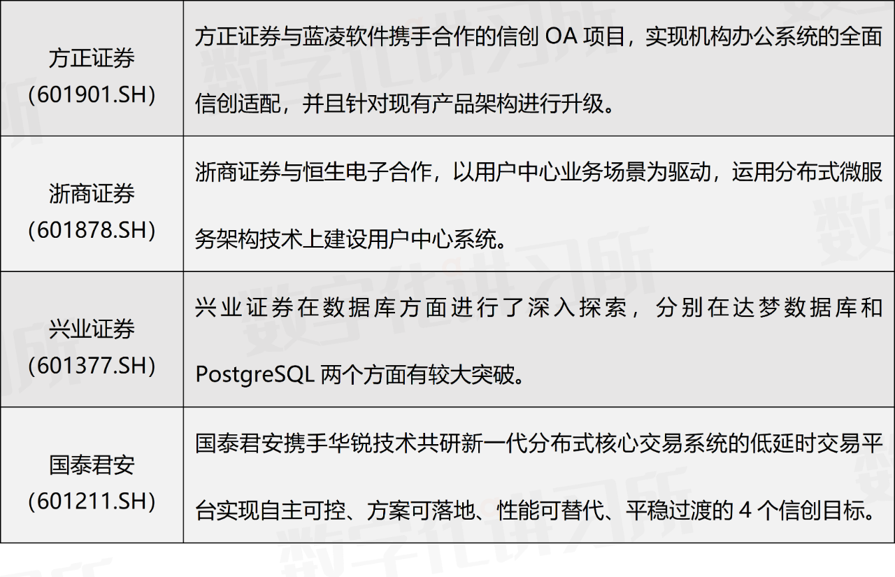 国信证券在系统信创建设方面,OTC系统联合金证股份(600446.SH)做信创试点;在OA系统方面,国信证券采用全信创环境,完成了OA系统整体的信创适配改造。