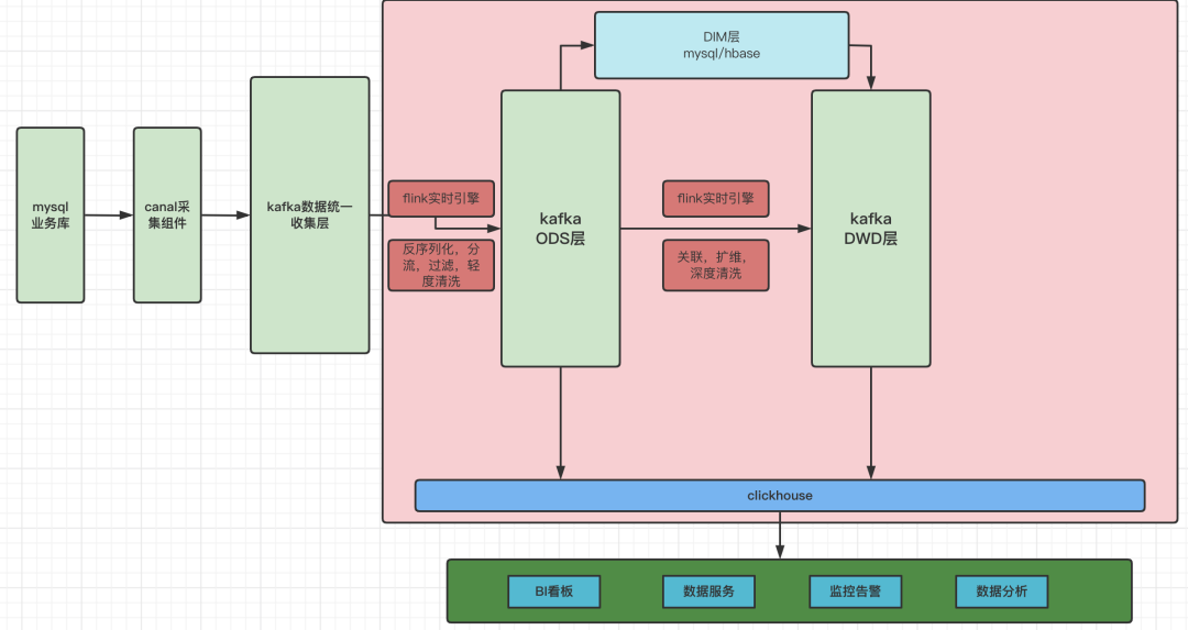此方案数据采集阶段跟 1.0 架构相同,都是利用 Canal 组件实时抽取业务库数据日志到 Kafka,ETL 阶段用 Flink Stream+Flink SQL 消费 Kafka 做数据清洗和分层,DIM 层数据存储在 Apache HBase(以下简称 HBase)和 MySQL 中,ODS、DWD 等其他层数据放入 Kafka,最后通过 Apache Flink(以下简称 Flink)对数据进行关联、扩维、深度清洗后写入 ClickHouse 对外提供查询。