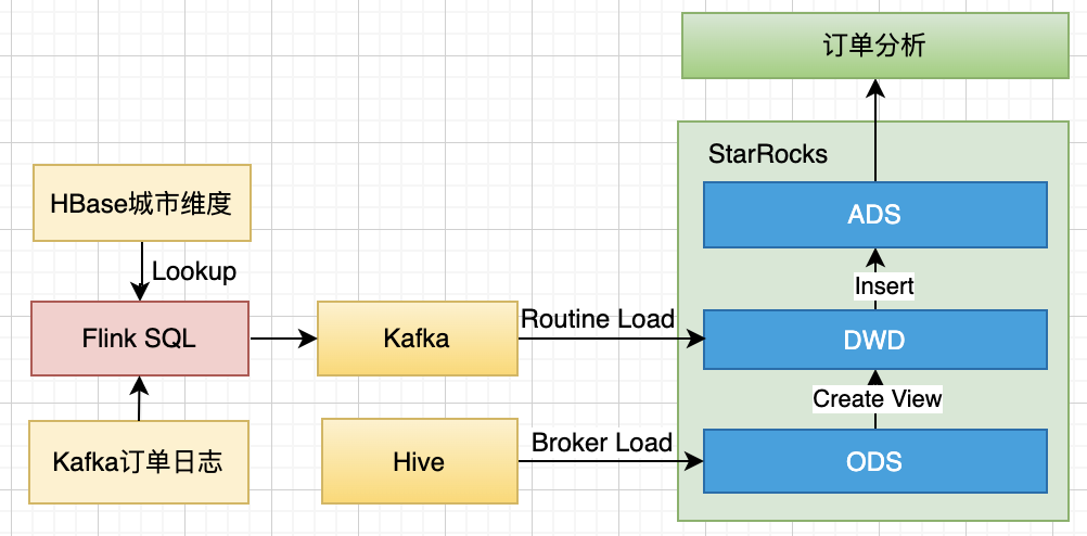 订单分析是我们的核心业务场景之一。引入 StarRocks 后,整个链路设计如下:
