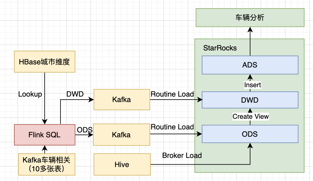上述基于 StarRocks 搭建的数据链路,则解决了这些问题。对于能提前关联的数据,我们用 Flink SQL 打成大宽表入库,需要历史数据且状态时刻变化的数据全量从 Hive 导入 StarRocks,然后通过 Canal 抽取增量数据到 Kafka ,再导入 StarRocks 来更新状态。在最上层创建逻辑视图,通过调度平台定时计算输出到 ADS 层,供业务方使用。当需要口径做变更,或者查看不同维度的车辆指标时,我们只需新建一个逻辑视图即可。