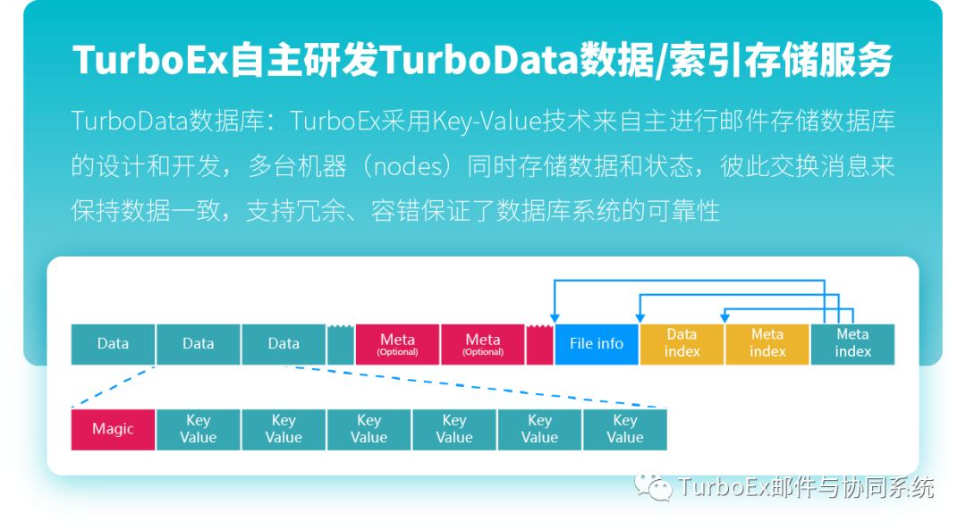 TurboEx发布的TurboData存储数据库软件技术是对上述需求的良好支持,TurboData存储数据库软件是一款key-value 存储数据库,用于存储MIMEJson(Json + 二进制)数据格式数据,提供对JSON 数据多层级字段的索引、和对文本值的全文索引。并支持多机集群,在线扩容,加密压缩等部署方式,适用于政府、金融、企业集团的大型邮件数据、文件数据、办公数据的存储仓库应用场景。
