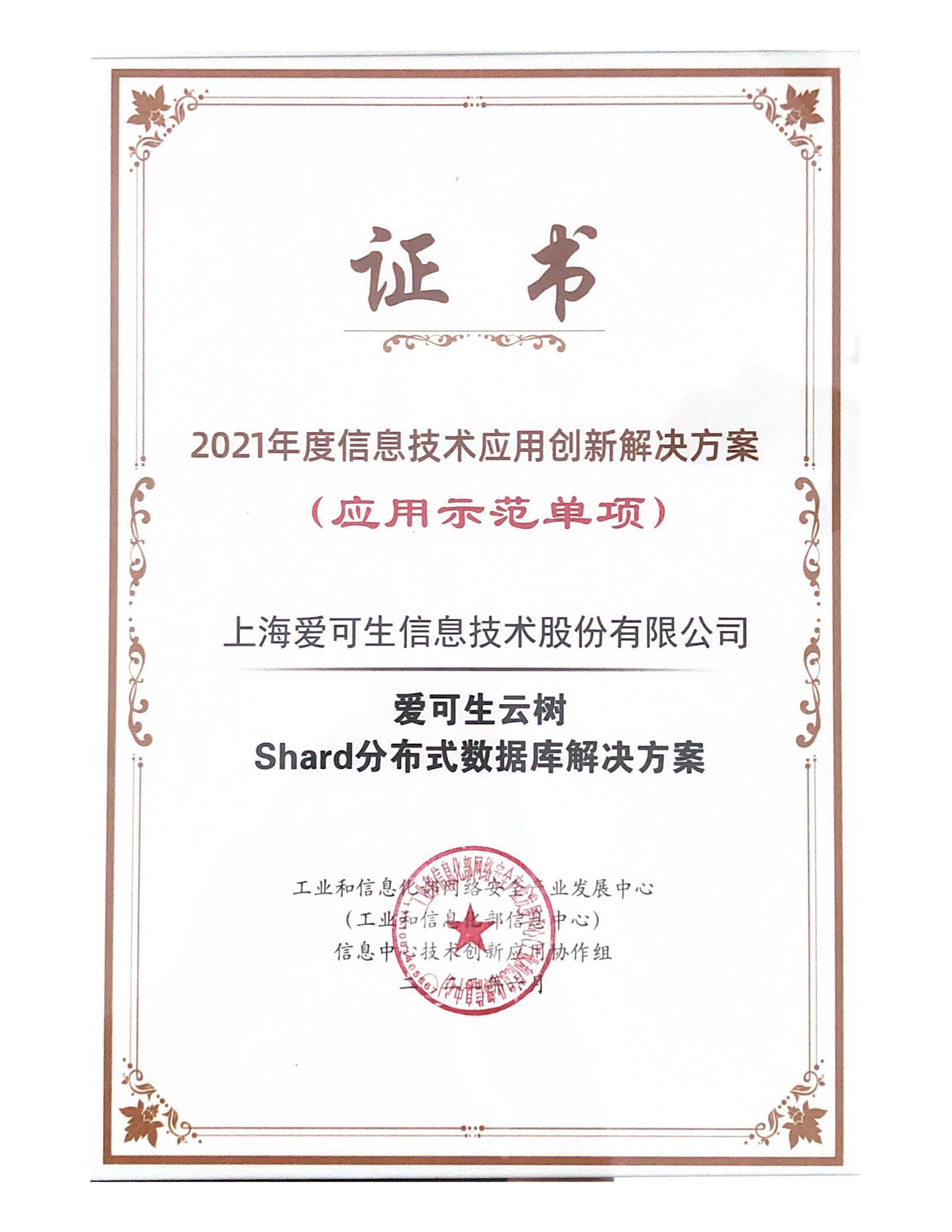 近日,由工业和信息化部网络安全产业发展中心、信息中心技术创新应用协作组共同主办的2021年数字技术融合创新应用解决方案评选工作中,《爱可生云树®Shard分布式数据库解决方案》在663个解决方案中经过形式审查、技术评审、专家评审答辩、综合评议等多轮筛选,最终荣获2021年数字技术融合创新应用解决方案(应用示范单项)奖,充分彰显爱可生在信创数据库领域的创新能力和领先实力!