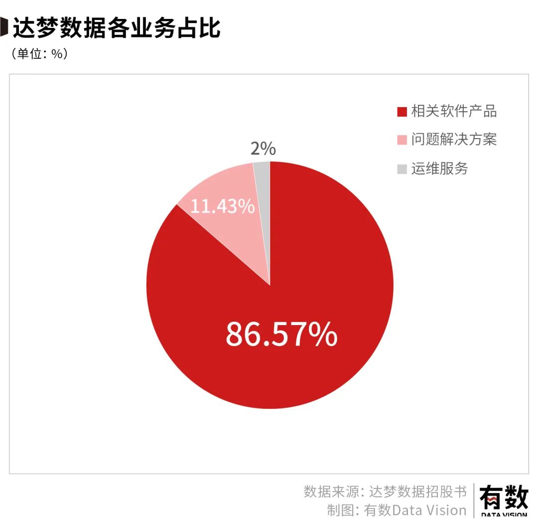 达梦数据的主营业务包括三类:相关软件产品(卖标准化量产的软件)、问题解决方案(卖定制的软件方案),以及后续的运营维护。