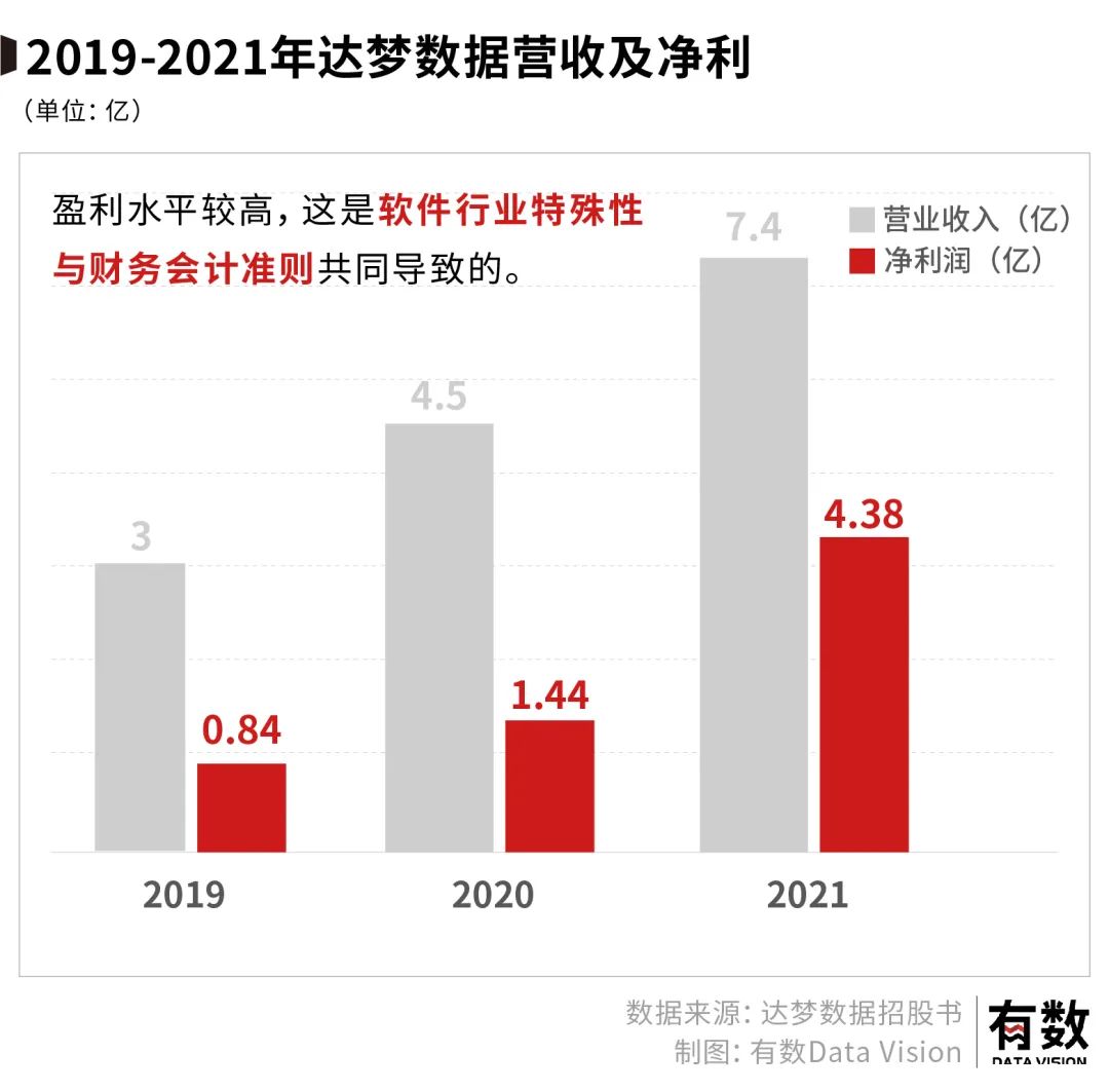 达梦数据2019-2021年营收分别为3亿,4.5亿,7.4亿,净利润为8374万,1.44亿,4.38亿,盈利水平较高。