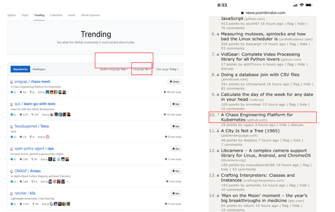 Chaos Mesh 开源消息发布的当天,直接登上了 Hacker News 首页,后面连续几天还登顶 Github Go 语言 Treding 项目榜首。Chaos Mesh 的火爆出乎了我的意料,但是开心的同时也多了些压力。