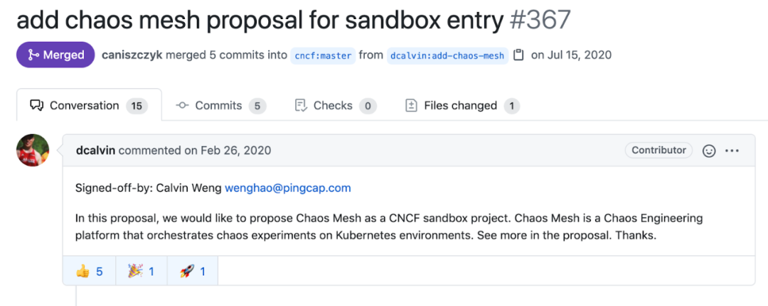 经过调研,CNCF 生态中刚好缺少一个推动混沌工程标准的项目,这更加坚定了我们把 Chaos Mesh 托管到 CNCF 的决心。这里不得不说的是 PingCAP 的理想主义和坚定的全球化战略,让我们在做任何项目的时候,都是毫无保留,考虑的不再是简单的某几个人,而是整个生态,整个世界。这进一步坚定了我们把 Chaos Mesh 去和全世界分享的决心, CNCF 正是一个最佳的选择与平台。在短暂准备后,我们就开始了这段漫长的托管申请之路。