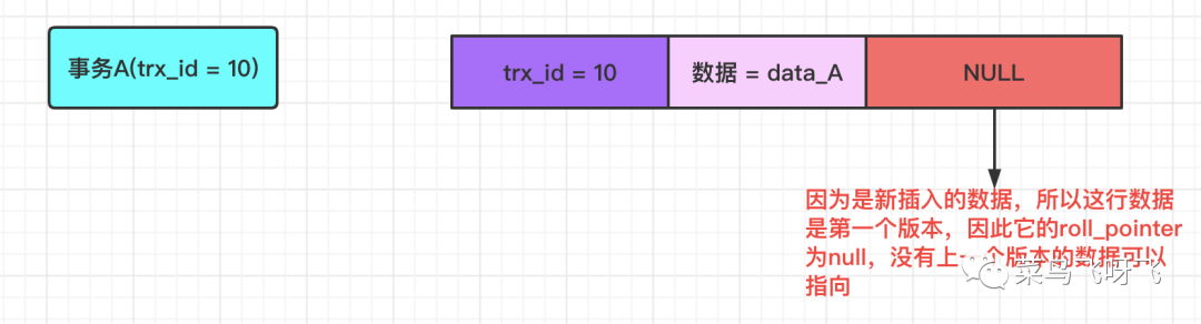 由于是新插入的一条数据,所以这行数据是第一个版本,也就是它没有上一个数据版本,因此它的 roll_pointer 为 null。