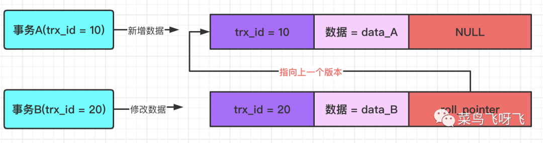 接着事务 B(trx_id=20),将这行数据的值修改为 data_B,同样也会记录一条 undo log,如下图所示,这条 undo log 的 roll_pointer 指针会指向上一个数据版本的 undo log,也就是指向事务 A 写入的那一行 undo log。