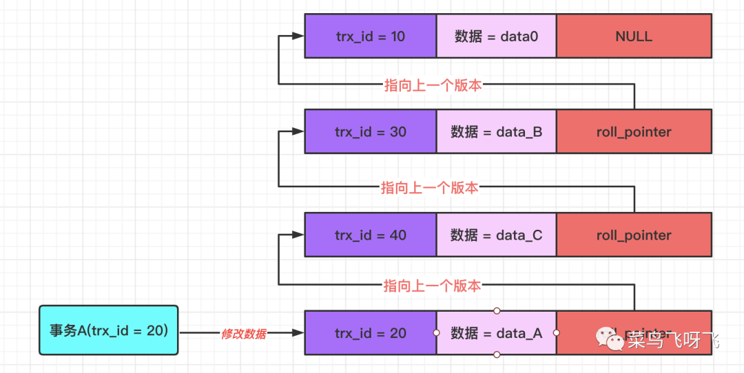 接着事务 A(trx_id=20)去修改数据,将数据修改为 data_A,那么就会记录一条 undo log,示意图如下: