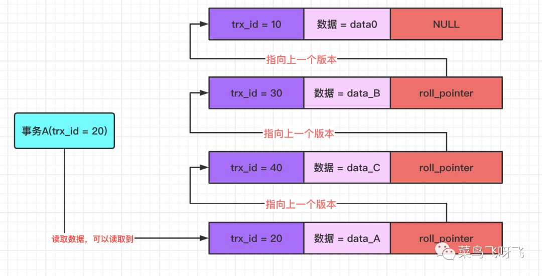 此时事务 A(trx_id=20)去读取数据,那么在 undo log 版本链中,数据最新版本的事务 id 为 40,由于此时事务 A 的 ReadView 中的 max_trx_id=31,40 大于 31,这表示当前版本的数据时在事务 A 之后提交的,因此对于事务 A 肯定是不能读取到的。所以此时事务 A 只能根据 roll_pointer 指针,沿着 undo log 版本向前找,结果发现上一个版本的 trx_id=30,自己还是不能读取到,所以再继续往前找,最终可以读取到 trx_id=10 的版本数据,因此最终事务 A 只能读取到 data0。