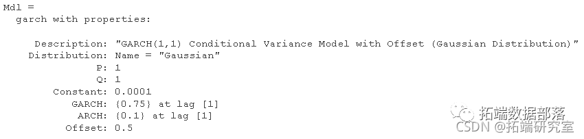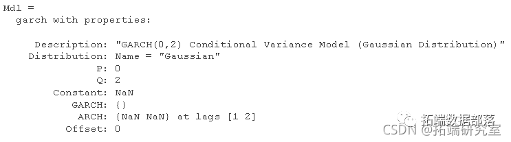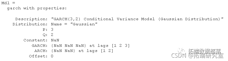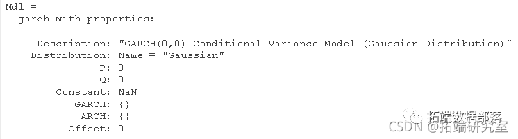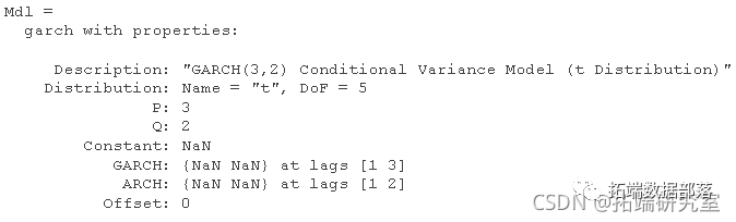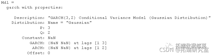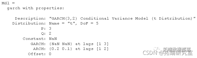 P 和 Q 分别是 GARCH 和 ARCH 多项式中的最大非零滞后。其他模型参数包括平均模型偏移、条件方差模型常数和分布。