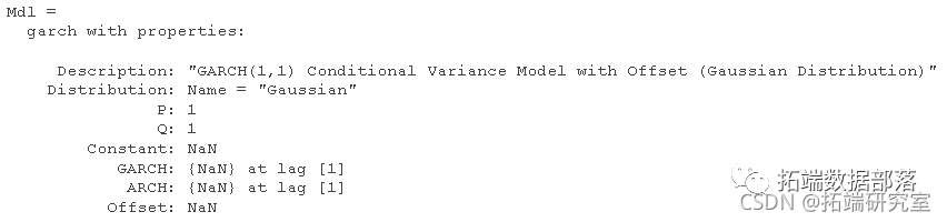 指定 GARCH(1,1) 模型。默认情况下,条件平均模型偏移为零。指定偏移量为 NaN
