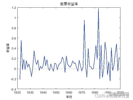 将 GARCH 模型拟合到 1922-1999 年股票收益率的年度时间序列。