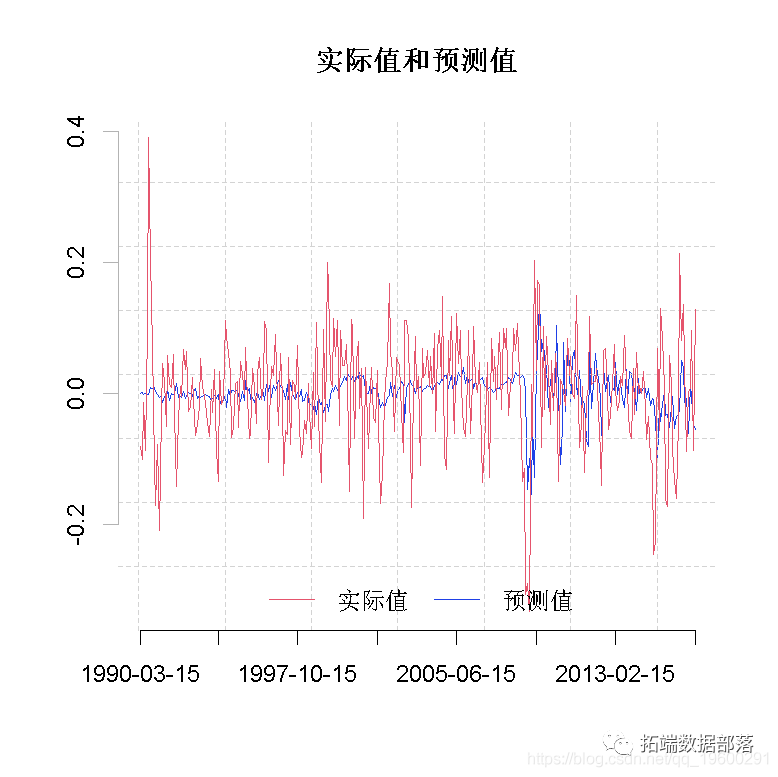 plot(x$y, type="l", ylim=c(min(x$y,x$y.hat),max(x$y,x$y.hat)), xlab="", ylab="", main="实际值和预测值", axes = F)