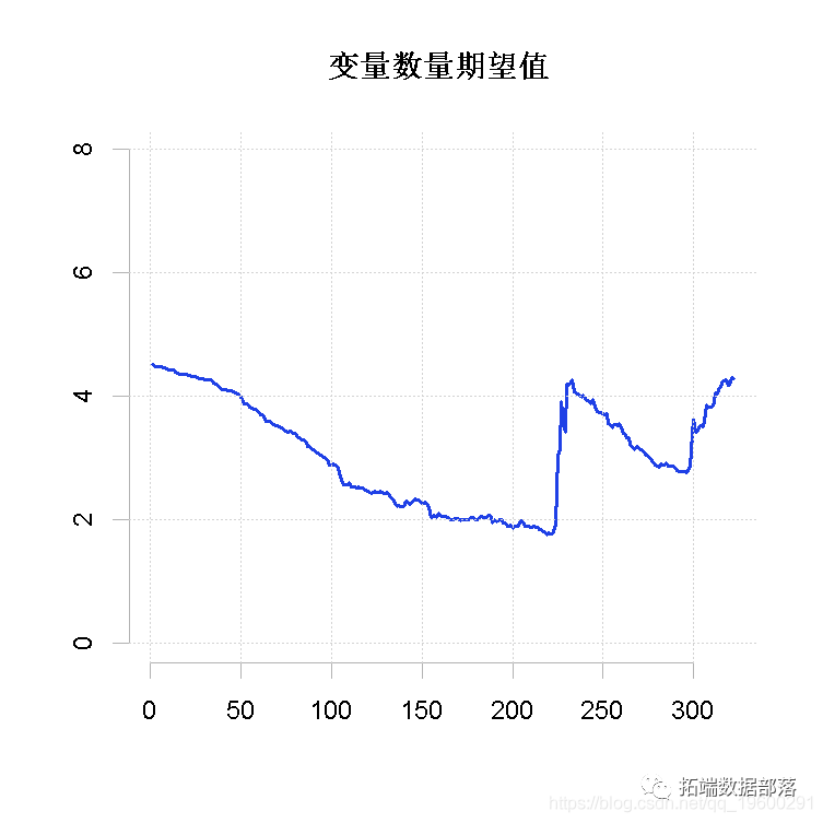 plot( exp.var, type="l" ylim=c(0,ncol(x$models)) main="变量数量期望值 ", axes = F)