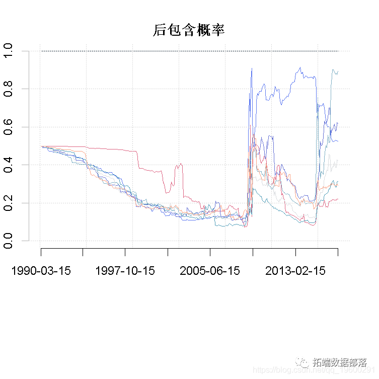 plot( post.incl\[,i+1\], type="l", col=col\[i+1\], ylim=c(0,1), xlab="", ylab="", main="后包含概率", axes = F)