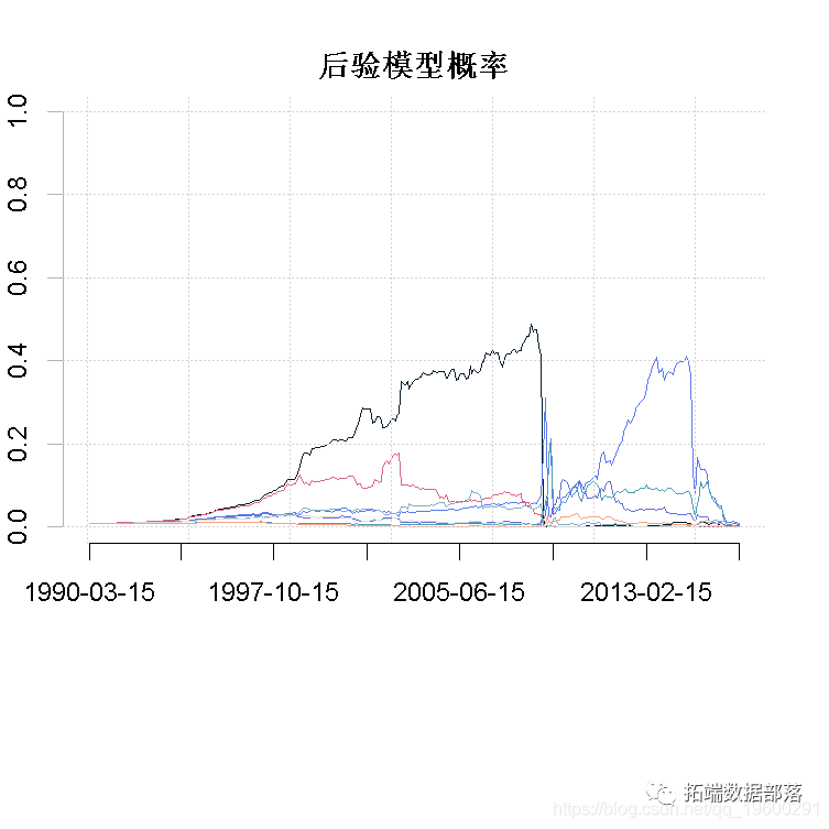 plot(x$post.mod\[,i+1\], type="l" ylab="", main="后验模型概率", axes = F)