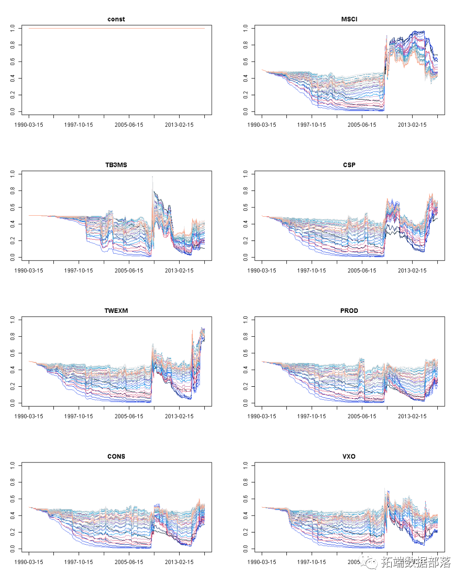 图3应与图4可以看出。虽然,相对变量的重要性可能很高,但这个变量的回归系数的预期值可能在0左右。事实上,高的相对变量重要性同时观察到MSCI、CSP和TWEXM的预期回归系数不为零。所以,这个分析现在证实了这三个因素在2007年和2013年之间对原油价格起到了重要的预测作用。自2013年以来,股票市场的作用减少了,被汇率所取代。在2013年前后,最重要的作用是由发达股票市场发挥的。